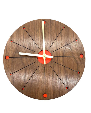 Orange Atomic Starburst Clock, Geometric Clock, Retro 50s Decor, Walnut Wall Clock, Handmade Laser Cut Clock, Mid Century Modern Decor